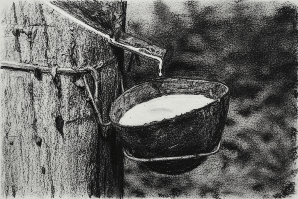 Latex is won by making incisions in the tree bark and collecting the fluid in vessels. This process is known as “tapping”. It’s tapped as milky fluid, that then coagulates when exposed to oxygen.
